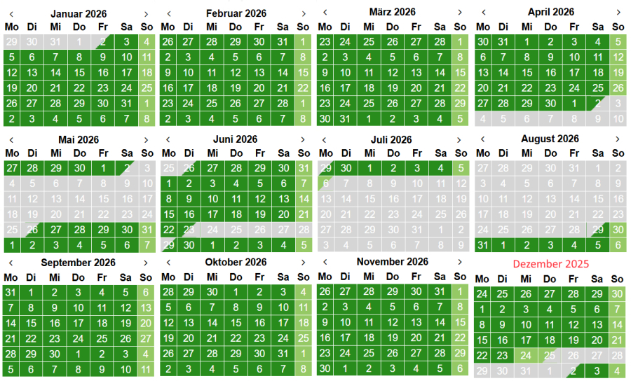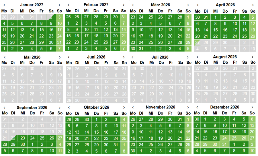 An-/Abreisen sind an Sonn- und Feiertagen (hellgrün) in der Hauptsaison nicht möglich. Mindestaufenthalt in der Hauptsaison beträgt 7 Tage, in der Nebensaison 5 Tage.